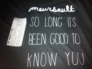 I’ve been lucky enough to see some amazing gigs at the Queen’s Hall throughout the years; “Frightened Rabbit“, “Feist” and “Bon Iver” particularly stick in the mind, and tonight “Meursault” were up there with any of them. Congratulations to the band and “Song by Toad” for putting on such a marvellous evening for all of us sensible people who these days give the predictable and uninspiring T in the Park as wide a berth as possible.